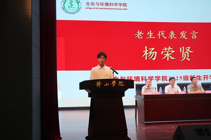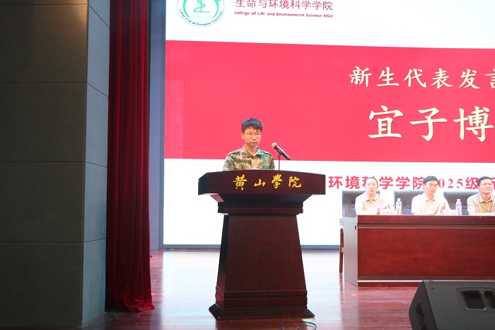 在庄严的国歌声中,典礼正式拉开帷幕。生命与环境科学学院副院长(主持行政工作)万志兵代表学院向全体新生致欢迎辞,他对新生们跨越山海、奔赴而来的选择表示热烈祝贺,并结合学院的办学特色与学科优势,向新生传递殷切期望。“希望你们珍惜最美的青春年华,在这片知识的沃土上深扎根系、汲取养分,保持好奇、奔流不息,连接时代、勇担使命,涵养人格、和谐发展。”万志兵以铿锵有力的话语寄语新生,鼓励大家“如黄山松般坚毅不拔,如新安江水般清澈向前,成长为有益社会、有益国家的栋梁之材。”。