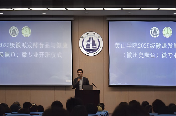 开班仪式上,微专业负责人吴永祥介绍了专业建设背景、培养目标与课程特色。该微专业依托生命与环境科学学院学科优势与黄山市特色发酵食品产业资源,围绕“健康中国”战略和地方产业发展需求,构建了以实践创新能力培养为核心的课程体系,涵盖发酵食品学、食品营养与健康等5门课程,实践学时占比超60%,并聘请政府部门及行业企业专家担任校外导师,推动产教深度融合。