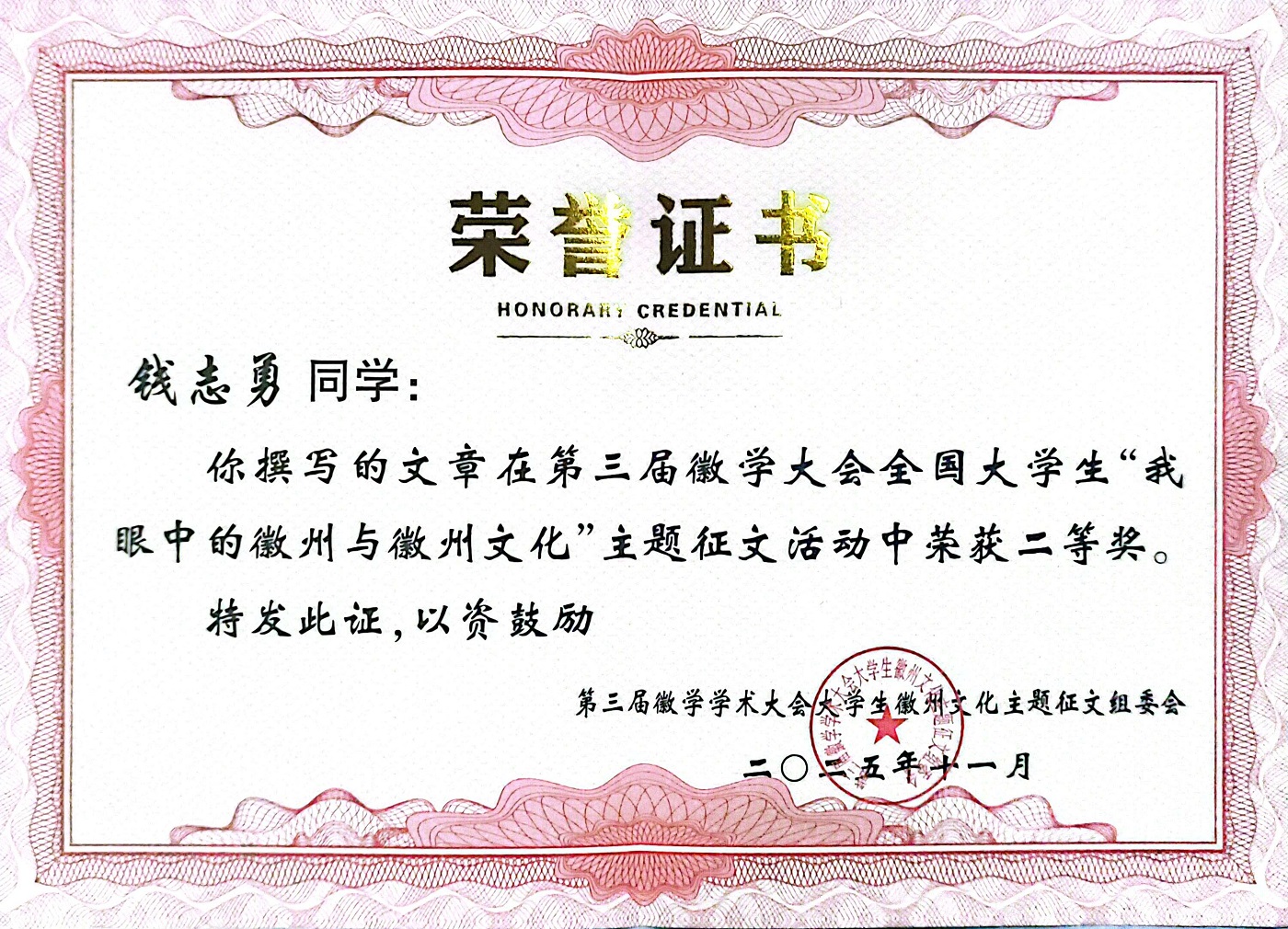 2025年11月8日,第三届徽学学术大会“我眼中的徽州与徽州文化”大学生征文颁奖典礼在黄山学院文博楼隆重举行,黄山学院生命与环境科学学院2022级园林专业的钱志勇凭借作品《徽亭》从全国100多所高校的398篇投稿中脱颖而出,斩获二等奖。