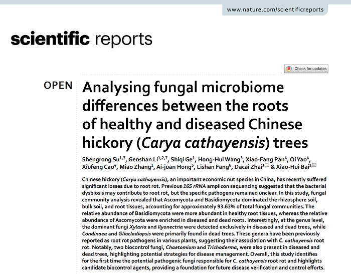 近日,我院特色林产业发展研究中心科研平台柏晓辉教授团队在国际知名学术期刊《Scientific Reports》(SCI一区)发表重磅研究成果,首次明确了导致歙县山核桃(Carya cathayensis)根腐病的潜在致病真菌,同时发现了具有应用前景的生防菌剂,为这一困扰产区多年的病害治理提供了关键科学依据,有望挽救山核桃产业的经济损失。