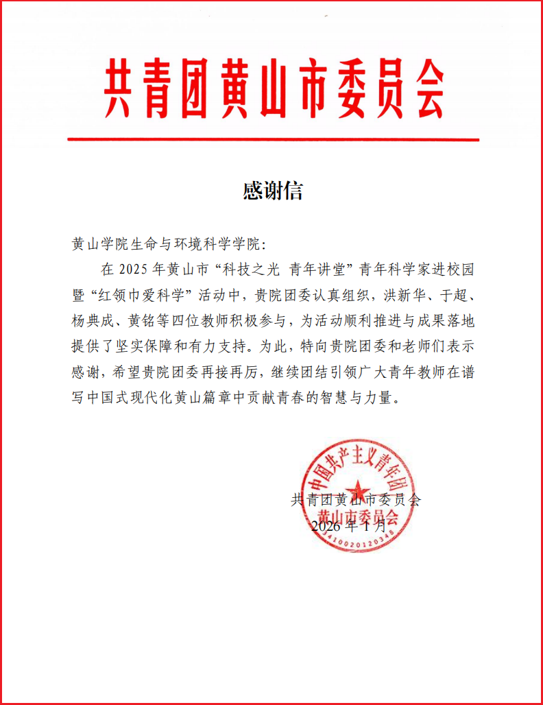 近日,生命与环境科学学院团委联合共青团黄山市委员会开展的“科技之光・青年讲堂”系列活动圆满落幕,并获得黄山团市委的正式感谢。该系列活动组织学院青年教师深入黄山市八所中小学,开展科普宣讲,覆盖近两千名学生,推动科技教育与青春实践深度融合。