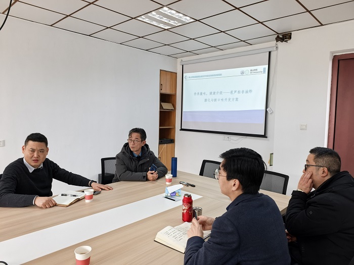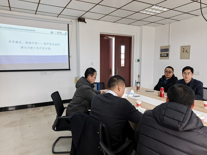 吴永祥教授介绍了团队的科研平台、师资力量与社会服务成效,展示了团队在黄山市高端绿色食品与徽派预制菜产业领域的研究成果。傅立磊书记表示,镇政府高度重视苞芦松这一地方特色产业的发展,并将其纳入“十五五”时期政府工作规划中。企业负责人方伟强详细介绍了公司发展现状,并指出当前苞芦松产品存在物流成本高、口味较单一、包装特色不足等现实问题。