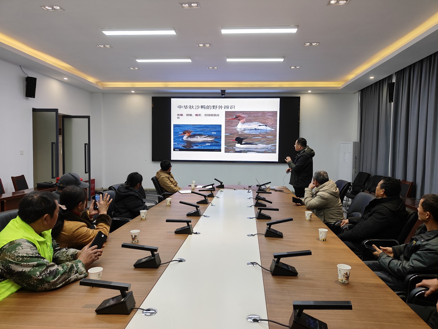 中华秋沙鸭作为国家一级重点保护野生动物,其保护研究是动物学、生态学及保护生物学领域的焦点课题。培训中,于超副教授充分发挥其在鸟类分类学、动物生态学方面的专长,从生物科学的核心基础——形态与系统分类入手,深入浅出地讲解了中华秋沙鸭区别于普通秋沙鸭和红胸秋沙鸭的关键鉴别特征、适应性形态结构及其行为生态学意义。他结合种群生态学与生物统计学原理,系统讲授了野外种群数量调查、动态监测方案设计、数据标准化采集与初步分析的科学方法,将生物科学的研究范式贯穿于监测全流程。