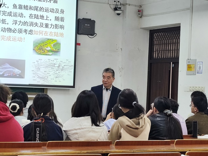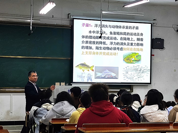 王德青老师凭借扎实的专业功底与清晰的教学逻辑,以颌的进化意义为切入点,围绕脊椎动物由水生向陆生演化的主线展开授课,层层剖析两栖动物登陆面临的生存矛盾与结构适应特征,帮助学生构建完整的演化知识体系,充分彰显以学生为中心的教学理念,为全院教师更新教学观念、创新教学设计提供了生动范例。在核心知识点讲授中,王德青紧扣教学思想观念大讨论中“推动课程思政与专业教学深度融合”的要求,在分析水生到陆生的演化矛盾时,融入改革发展的辩证思维,引导学生认识事物发展规律与科学的改革方法;在讲解两栖动物生存局限时,引申出新生事物在发展中逐步完善的深刻道理,激励学生勇于进取、持续奋进,切实将立德树人贯穿教学全过程。